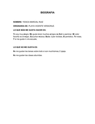 Yesica Marcial Ruiz es originaria de Playa Vicente Veracruz. Le gusta ser alegre, tener muchos amigos, salir a caminar, el color negro, escuchar música, bailar, leer revistas y periódicos, y asistir a la escuela. No le gustan las tareas abundantes ni las clases aburridas.