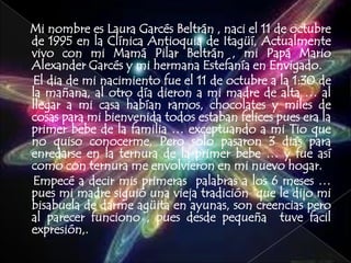 Laura Garcés Beltrán nació en 1995 en Itagüí y actualmente vive con su familia en Envigado. Tuvo una infancia feliz bailando y cantando, aunque un accidente con petardos cuando tenía 5 años fue traumático. Asistió a la escuela primaria Pío XII donde se destacó académicamente. Actualmente cursa el grado 11 en el colegio Comercial de Envigado. Sus pasiones son bailar y pasar tiempo con amigos. Teme a la soledad y perder a su familia.