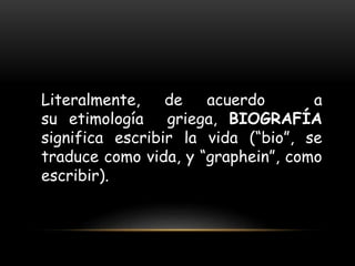 La biografía consiste en escribir la vida de una persona, ya sea de uno mismo (autobiografía) o de otra persona. Relata los hechos más relevantes de la persona desde su nacimiento hasta su muerte, contextualizándolos en la época sociocultural. Generalmente se escribe de forma narrativa y cronológica, aunque a veces puede ser audiovisual.
