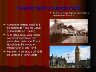 Alexander Fleming nació en 1881 en Escocia y murió en 1955 en Londres. Descubrió la penicilina de forma accidental al observar que un moho inhibía el crecimiento de las bacterias en uno de sus cultivos. La penicilina fue el primer antibiótico efectivo y salvó muchas vidas. Fleming dedicó su vida a la investigación bacteriológica y recibió el Premio Nobel de Medicina en 1945 por el descubrimiento de la penicilina.