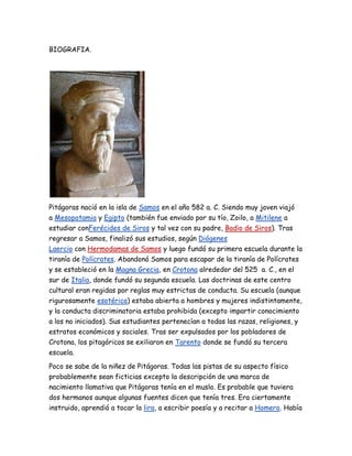 Pitágoras nació en Samos en el 582 a.C. y viajó a Egipto y Mesopotamia para estudiar. Fundó escuelas en Samos, Crotona y Tarento donde enseñó que el universo es una armonía basada en relaciones numéricas y que el alma puede purificarse a través de la música y las matemáticas. Los pitagóricos hicieron contribuciones importantes a las matemáticas como la demostración del teorema de Pitágoras y el descubrimiento de los números irracional