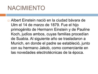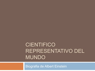 El documento presenta una biografía de Albert Einstein. Detalla eventos clave en su vida como su nacimiento en Alemania, su educación en Suiza, su trabajo como profesor y sus descubrimientos científicos revolucionarios en física como la relatividad especial y general y la equivalencia entre masa y energía. Einstein murió en 1955 en Estados Unidos siendo considerado uno de los científicos más influyentes de la historia.