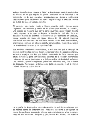 Arquímedes fue un importante matemático griego del siglo III a.C. que vivió en Siracusa. Realizó importantes avances en matemáticas e ingeniería, incluyendo el descubrimiento del principio que lleva su nombre sobre la flotación de los cuerpos. También inventó máquinas de guerra y otras invenciones mecánicas. Una famosa anécdota cuenta cómo utilizó el principio de la flotación para determinar si una corona estaba hecha de oro puro o tenía plata añadida.