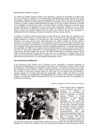 Charles Chaplin nació en Londres en 1889 en una familia de artistas de variedades. Tuvo una infancia difícil debido a problemas familiares y económicos. Comenzó su carrera como actor infantil y luego se unió a la compañía de Fred Karno, donde perfeccionó su habilidad para la mímica. En 1913 se mudó a Hollywood y firmó con la productora Keystone, donde protagonizó decenas de cortometrajes mudos que lo convirtieron en una estrella. Más tarde firmó con otras productoras donde desarrolló plenamente su personaje