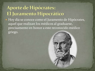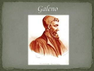 Galeno fue un médico griego del siglo II d.C. conocido como el "Padre de la Medicina Moderna". Siguió los principios de Hipócrates y realizó importantes descubrimientos anatómicos y fisiológicos a través de disecciones de animales. Hipócrates, nacido en el siglo V a.C., es considerado el "Padre de la Medicina" por su enfoque científico y ético de la medicina. Ambos fueron figuras influyentes durante siglos y sentaron las bases de la medicina occidental moderna