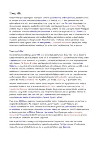 Nelson Velásquez es un cantante vallenato colombiano hijo del acordeonero Aníbal Velásquez. Comenzó su carrera musical a una edad temprana y se unió a varias agrupaciones vallenatas como corista. En 1995 lanzó su carrera como solista con el acordeonero Niky López. Formaron el dúo Los Inquietos de Colombia. Ha lanzado varios álbumes exitosos como solista y ha realizado giras internacionales en países de América Latina y Estados Unidos. Se ha convertido en