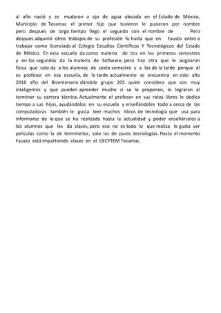 Este documento presenta un resumen biográfico de Fausto Agustín Rodríguez Rodríguez. Nació en 1964 en Zumpango, México y tuvo una infancia feliz jugando con sus hermanos. Estudió la primaria y secundaria con calificaciones regulares y luego estudió la carrera de técnico electricista en una escuela vocacional. Más tarde ingresó al IPN para estudiar ingeniería eléctrica. En 1988 se casó con Claudia Beatriz Fragoso Beltrán y tuvieron dos hijos. Actualmente trabaja como