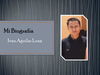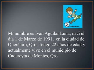 Este documento presenta una breve biografía de Ivan Aguilar Luna, un hombre de 22 años que nació en Querétaro, México. Detalla su educación desde el kínder hasta la preparatoria, incluyendo los amigos que hizo y las experiencias escolares. También menciona que le gusta jugar fútbol con un equipo local y pasar tiempo con sus amigos jugando videojuegos y juegos de mesa.