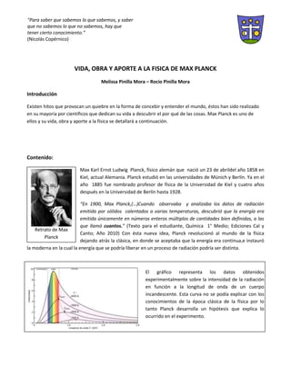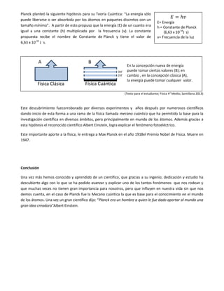 Max Planck fue un físico alemán que revolucionó la física en 1900 con su teoría cuántica, la cual establece que la energía solo puede ser emitida o absorbida por los átomos en cantidades discretas llamadas cuantos. Planck descubrió que la energía radiada por un cuerpo sólido depende de la frecuencia de la radiación y de una constante fundamental que lleva su nombre, la constante de Planck. Su teoría cuántica sentó las bases de la mecánica cuántica y permitió explicar fenómen