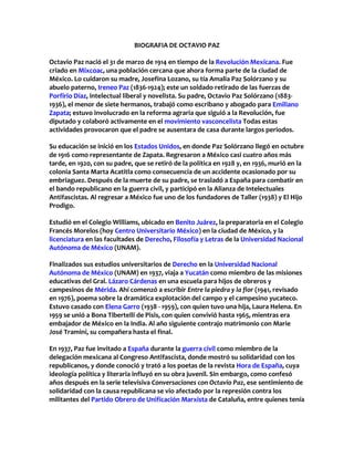 Octavio Paz nació en 1914 en México. Fue un poeta, ensayista y diplomático mexicano. Estudió en varias universidades y escribió varios libros e influyentes ensayos. Tuvo una carrera diplomática y fue embajador de México en la India, pero renunció en protesta por la masacre de Tlatelolco en 1968. Murió en 1998 en la Ciudad de México.