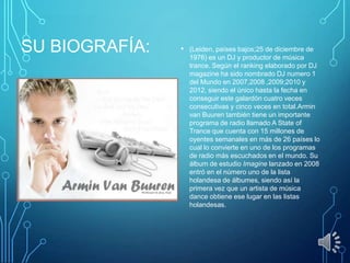 Armin Van Buuren es un DJ y productor de música trance holandés que ha sido nombrado el número 1 del mundo por la revista DJ Magazine cinco veces. También tiene un popular programa de radio semanal llamado A State of Trance con 15 millones de oyentes en todo el mundo. Van Buuren se ha sentido fascinado por la música desde una edad temprana y a los 14 años compró su primer mezclador para comenzar a producir su propia música.
