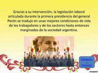 El documento presenta información sobre Eva Perón, líder política y esposa del presidente Juan Domingo Perón de Argentina. Gracias a su labor, la legislación laboral durante la presidencia de Perón mejoró las condiciones de vida de los trabajadores y sectores marginados. Promovió la participación de la mujer en la política a través del Partido Peronista Femenino y buscó su mejor integración en el mercado laboral.