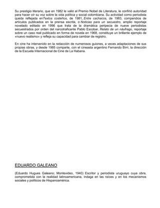 El documento presenta biografías de cuatro destacados escritores latinoamericanos: Gabriel García Márquez, Eduardo Galeano, Pablo Neruda y Gabriela Mistral. Resume las principales obras, influencias literarias y reconocimientos de cada autor, así como su compromiso político y su contribución a la literatura de Latinoamérica.