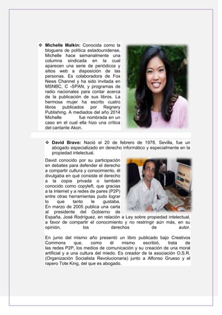 El documento presenta biografías breves de varias personas notables. Nir Ofir co-fundó blogTV y blogDay.org, plataformas que permitieron el surgimiento de decenas de comunidades y proyectos. Jessica Claire comenzó como modelo e interpretó papeles en producciones musicales y series de TV como 7th Heaven. Michelle Malkin es una bloguera política estadounidense que escribe una columna semanal y ha publicado cuatro libros. David Bravo fue un abogado especializado en derecho informático y propiedad intelectual que defendía el derecho a