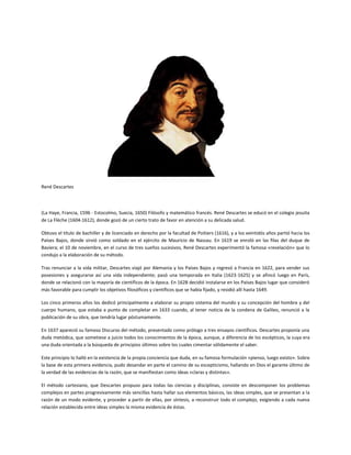 René Descartes fue un filósofo y matemático francés nacido en 1596 que desarrolló el racionalismo moderno. Se educó en un colegio jesuita y obtuvo títulos universitarios antes de servir como soldado. En 1619 tuvo tres sueños que lo llevaron a desarrollar su método filosófico. Publicó su Discurso del Método en 1637 donde propuso la duda metódica y estableció el principio "pienso, luego existo". Descartes consideró que la mente y el cuerpo