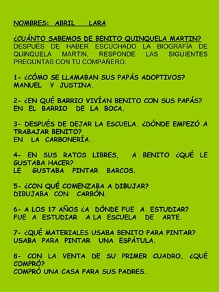 Los estudiantes respondieron preguntas sobre la biografía de Benito Quinquela Martín después de escucharla. Aprendieron que Benito fue adoptado por Manuel y Justina, vivió en el barrio de La Boca, trabajó en una carbonería después de dejar la escuela, le gustaba pintar barcos en su tiempo libre usando carbón, estudió en la Escuela de Arte a los 17 años y compró una casa para sus padres con la venta de su primer cuadro.