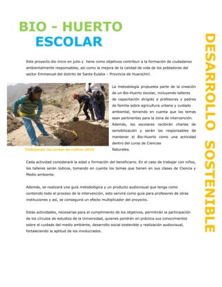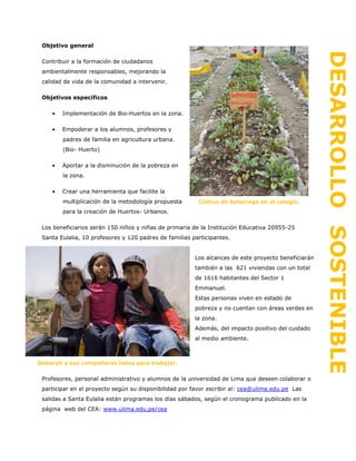 Este proyecto, iniciado en julio, tiene como objetivos contribuir a la formación de ciudadanos ambientalmente responsables en el distrito de Santa Eulalia y mejorar la calidad de vida de sus pobladores a través de la creación de un biohuerto escolar, talleres de capacitación sobre agricultura urbana y charlas de sensibilización para los estudiantes. El proyecto beneficiará a 150 estudiantes, 10 profesores y 120 padres de familia, así como a los 1616 habitantes del sector a través de áreas verdes y del