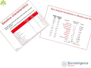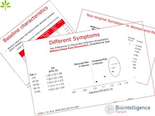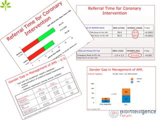 Este documento discute las diferencias biológicas y de percepción entre hombres y mujeres con respecto a las enfermedades cardíacas. Señala que las mujeres se explican y perciben los síntomas de forma distinta, y pueden no considerar que las enfermedades del corazón les afectan. También menciona datos sobre el tratamiento y evolución de los infartos de miocardio en mujeres, así como tasas de mortalidad hospitalaria y al mes después de un infarto. El documento concluye que es necesario continuar recopilando datos, actuar