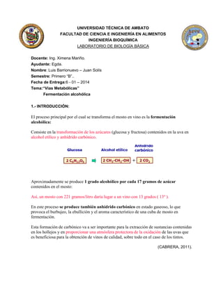 El documento describe el proceso de fermentación alcohólica que convierte los azúcares en el mosto de uva en alcohol etílico y anhídrido carbónico. Se miden parámetros iniciales como el pH, acidez y grados Brix del mosto, y se añade azúcar y metabisulfito de sodio. Luego se observan cambios en el mosto durante varias semanas de fermentación donde los azúcares se transforman en alcohol y dióxido de carbono, elevando el grado alcohólico y
