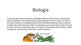 El documento habla sobre la carrera de biología que el autor está cursando, la cual trata sobre los seres vivos en la Tierra, la biodiversidad global y la importancia de cuidar el medio ambiente y los recursos naturales que sustentan la vida.