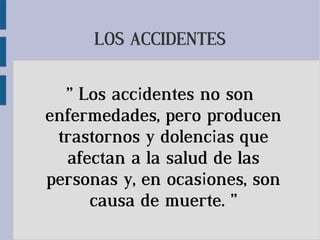 Los accidentes pueden clasificarse en tres grupos: accidentes domésticos que ocurren en el hogar, accidentes laborales que ocurren en el trabajo, y accidentes de tráfico. Estos accidentes pueden causar trastornos de salud y en algunos casos la muerte. Es importante aplicar primeros auxilios como tratar hemorragias, curar heridas y tratar quemaduras hasta que llegue la asistencia médica. También se deben tomar medidas de prevención como mantener objetos peligrosos fuera del alcance de los niños y usar equipo de seg