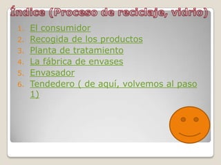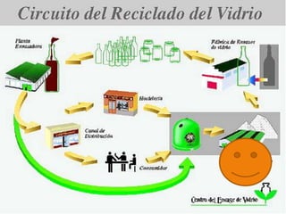 El documento describe las 6 etapas del ciclo de reciclaje del vidrio: 1) El consumidor separa los tipos de basura, 2) El vidrio se recoge y lleva a la planta de tratamiento, 3) En la planta de tratamiento se limpia y tritura el vidrio para convertirlo en calcín, 4) El calcín se transforma en nuevos envases en la fábrica de envases, 5) El envasador rellena los envases con productos, 6) Los productos envasados se venden en los tendederos para volver a usarse.