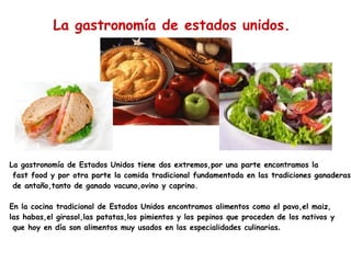 El documento resume la gastronomía de Estados Unidos, incluyendo la comida tradicional y la comida rápida. La comida rápida se ha vuelto muy popular pero también ha contribuido a problemas de salud como la obesidad. El documento también explora la historia y el impacto de alimentos populares como el perrito caliente y la hamburguesa.
