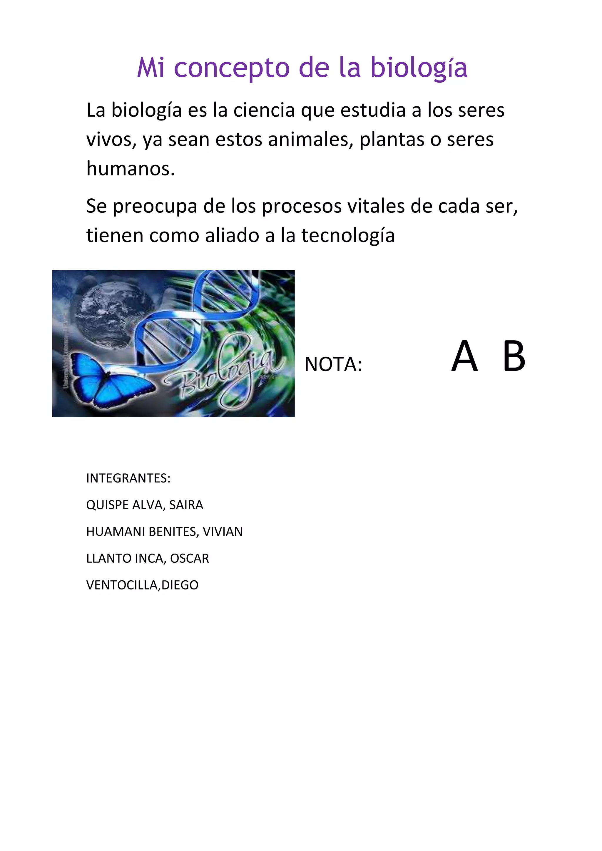 Mi concepto dela biología La biología es la ciencia que estudia a los seres vivos, ya sean estos animales, plantas o seres humanos. Se preocupa de los procesos vitales de cada ser, tienen como aliado a la tecnología NOTA: A B INTEGRANTES: QUISPE ALVA, SAIRA HUAMANI BENITES, VIVIAN LLANTO INCA, OSCAR VENTOCILLA,DIEGO