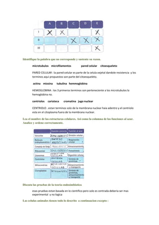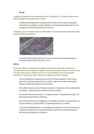El documento presenta información sobre diversos temas celulares. Explica que la relación entre la superficie y el volumen celular es un factor limitante del crecimiento celular, ya que entre más grande es la célula menos sustancias pueden intercambiarse, obligando a la célula a dividirse. También presenta preguntas sobre estructuras y procesos celulares como la mitosis y las enzimas, con tablas y gráficos para analizar.