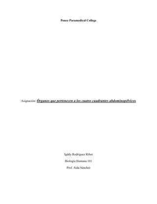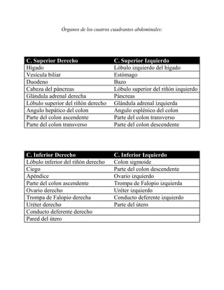Este documento presenta información sobre los órganos que pertenecen a los cuatro cuadrantes abdominales y pélvicos. Describe los órganos que se encuentran en cada cuadrante superior e inferior derecho e izquierdo, incluyendo el hígado, bazo, riñones, intestinos y órganos reproductivos.