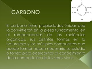 El documento describe las biomoléculas que componen los seres vivos. Explica que están compuestas principalmente por carbono, hidrógeno, oxígeno, nitrógeno, azufre y fósforo, los cuales permiten la formación de enlaces y estructuras complejas. Luego detalla los principales tipos de biomoléculas: glúcidos, proteínas, lípidos y ácidos nucleicos; y brinda detalles sobre su composición y estructura. Finalmente enfatiza la importancia vital de estas biomoléculas para la
