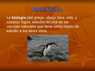 Este documento presenta una introducción a la biología como la ciencia que estudia a los seres vivos. Explica que la biología cubre tanto la descripción de organismos individuales como de especies, y las interacciones entre organismos y el medio ambiente. Además, describe las dos disciplinas principales de la taxonomía, la botánica y la zoología, indicando que la botánica estudia las plantas y la zoología estudia los animales. Finalmente, clasifica a los animales en vertebrados e invertebrados.