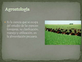 El documento presenta definiciones breves de diferentes ramas de la biología, incluyendo la forrajicultura, micología, bacteriología, microbiología, parasitología, botánica, zoología, etología, citología, ornitología, carcinología, herpetología y embriología. Cada una se enfoca en el estudio de un tipo particular de organismos vivientes o en aspectos específicos de la biología.