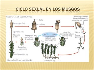 Los musgos dependen del agua para su reproducción. La fase dominante en su ciclo de vida es la fase gametofítica, donde se forman los anteridios y arquegonios que contienen los gametos. Las plantas visibles son los esporofitos, que producen esporas por meiosis en los esporangios de sus hojas. Estas esporas se convierten en un pequeño prótalo con raíces para absorber nutrientes del suelo. Las flores masculinas están compuestas por anteridios en forma de conos, mientras que las femeninas
