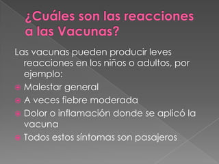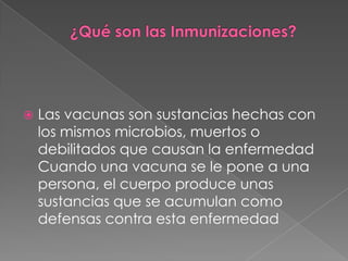 Las vacunas contienen microbios debilitados o muertos que causan enfermedades y ayudan a producir defensas en el cuerpo. Pueden causar leves reacciones como malestar, fiebre o dolor, pero son pasajeras. El tétanos es una enfermedad del sistema nervioso adquirida por contacto con bacterias en la tierra y causa rigidez muscular. El botulismo es una intoxicación por toxinas producidas por bacterias que pueden estar en alimentos mal preparados y causa debilidad y parálisis.