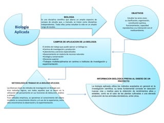 La biología aplicada es una disciplina científica que estudia los seres vivos a través de diversos campos como la clasificación, organización, composición química y funcionamiento. Sus objetivos son entender la vida en diferentes escalas y cómo interactúa con el medioambiente. Los biólogos aplicados trabajan en investigación, producción, asesoría ambiental, ecología, docencia y proyectos multidisciplinarios. Utilizan métodos lógicos como deducción y análisis, así como métodos empíricos como observación y experimentación para