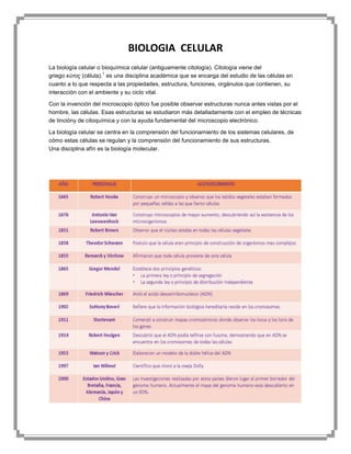 La biología celular estudia las células, incluyendo sus propiedades, estructura, funciones, orgánulos internos, interacción con el ambiente y ciclo vital. El descubrimiento de las células fue posible con el microscopio óptico, y desde entonces se han estudiado en más detalle con técnicas de tinción, citoquímica y microscopía electrónica. La biología celular se enfoca en comprender el funcionamiento de los sistemas celulares y cómo las células se regulan a sí mism