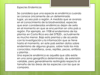 Este documento resume las especies endémicas, nativas, introducidas y en peligro de extinción en Ecuador. Explica que las especies endémicas solo existen en una región determinada, mientras que las nativas pertenecen naturalmente a una región. Las especies introducidas fueron llevadas a una nueva área por humanos. El documento luego describe varias especies en peligro de extinción en Ecuador, incluyendo el oso de anteojos, mono chorongo, tapir amazónico, cóndor andino y otros, y explica cómo la