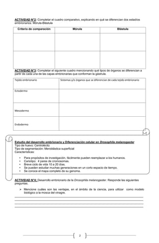 Este documento presenta una guía de estudio sobre el desarrollo embrionario y la diferenciación celular en Drosophila melanogaster. Incluye información sobre las etapas del desarrollo embrionario, los tipos de tejidos que se diferencian a partir de las capas embrionarias, y los genes involucrados en el desarrollo temprano de la mosca del vinagre, como los genes maternos, de segmentación, homeóticos y de polaridad de segmentos. También contiene actividades para que el estudiante aplique y analice