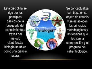 La biología, al igual que otras ciencias, está en constante dinamismo e innovación a través del descubrimiento científico. Se rige por los principios del método científico para estudiar objetos biológicos y comprender el mundo natural. Aplica técnicas experimentales para generar conocimiento empírico y teorías científicas sobre la vida.