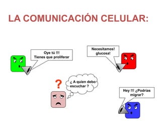 El documento describe los diferentes tipos de comunicación celular. Explica que las células generan señales que son recibidas por otras células blanco, las cuales pueden responder modificando su función. Describe los principales tipos de comunicación como la endocrina, paracrina, yuxtacrina y autocrina, así como los receptores celulares y procesos de señalización. También presenta modelos hipotéticos de diferentes tipos de células como las secretoras, absorbidas, fagocíticas y contráctiles.