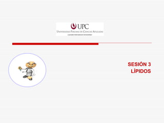 Este documento trata sobre los lípidos. Explica que los lípidos son moléculas biológicas que cumplen funciones estructurales, de almacenamiento de energía y de protección. Describe las características, clasificación y funciones principales de los lípidos, incluyendo los ácidos grasos, triglicéridos, fosfolípidos y esteroles. También cubre brevemente los carbohidratos como los monosacáridos, disacáridos y polisacáridos.
