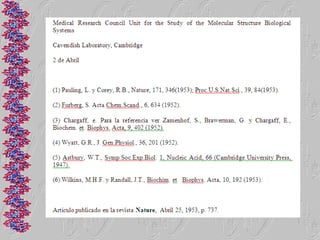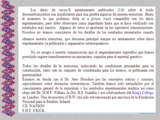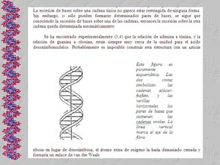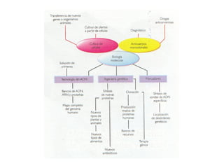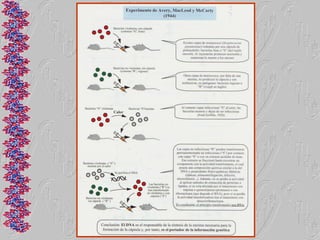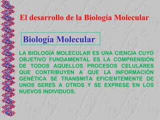 El documento proporciona una historia detallada del desarrollo de la biología molecular desde sus inicios a mediados del siglo XX hasta la actualidad. Algunos hitos clave incluyen el descubrimiento de que el ADN es el material genético en 1944, la determinación de la estructura de doble hélice del ADN en 1953, el desciframiento del código genético en 1965 y el modelo del operón propuesto por Jacob y Monod en la misma década. También se describe brevemente el desarrollo de la biología molecular en México a partir