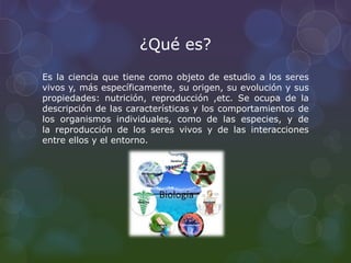 Este documento resume la carrera de biología en Colombia. Explica que la biología estudia los seres vivos y sus propiedades. Incluye subramas como la anatomía, ecología y fisiología. También describe 7 universidades que ofrecen el programa y resalta los enfoques de las universidades del Rosario, El Bosque y Nacional. Finalmente, explica campos laborales como la docencia, investigación y asesoría científica.