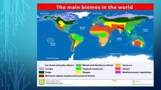 Este documento describe los diferentes biomas o zonas de vida de la Tierra, clasificados por su clima y vegetación predominantes. Se mencionan las selvas tropicales, sabanas, desiertos cálidos, bosque mediterráneo, bosque caducifolio, estepas, taiga y tundra, y para cada uno se proporcionan detalles sobre su ubicación, clima y precipitaciones características.