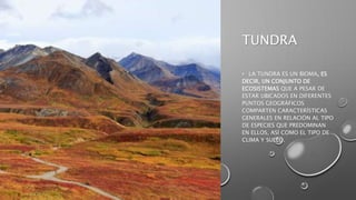 El documento presenta información sobre diferentes biomas terrestres como la tundra, taiga, bosques lluviosos, bosque caducifolio, pastizales, chaparral, desierto y sabana. Describe las características climáticas y de vegetación de cada bioma. También incluye información específica sobre el bosque seco ecuatoriano, sus amenazas como la deforestación, y las consecuencias como la pérdida de suelos y especies en peligro de extinción.