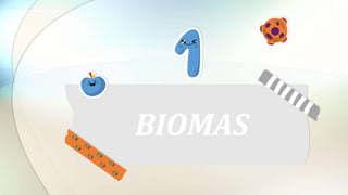 El documento presenta una descripción exhaustiva de los biomas, definiéndolos como comunidades ecológicas que se caracterizan por su flora, fauna y clima. Se clasifica en diferentes tipos de biomas terrestres, como sabanas, bosques, tundras y pastizales, destacando su importancia ecológica y la necesidad de conservación. Además, se abordan factores que afectan su desarrollo y características específicas de cada bioma.