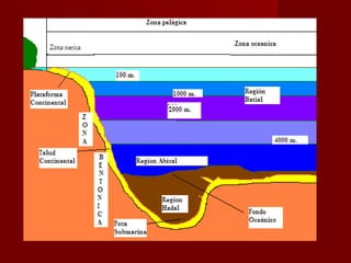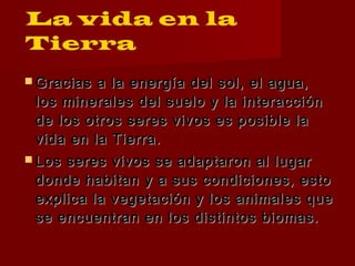 Este documento describe los diferentes biomas terrestres y acuáticos del planeta. Explica que los biomas se clasifican en terrestres como la tundra, el desierto, el chaparral, la sabana, los bosques, la selva y la pradera, y acuáticos como aguas dulces y aguas saladas. Para cada bioma se indica su distribución, clima, suelo, flora, fauna y los principales impactos ambientales. También resume las características de los biomas marinos como su profundidad, temperatura, cor