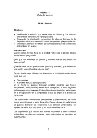 Este documento presenta información sobre biomas en México. Explica que la temperatura y precipitación determinan la distribución de biomas. Se dividen mapas de México en cuadrantes para analizar la temperatura, precipitación y biomas en diferentes regiones. Los estudiantes analizan cómo varían estos factores a lo largo del año en diferentes biomas, y cómo los seres vivos se adaptan a los cambios.