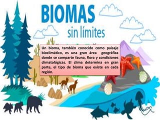 Este documento describe diferentes biomas y sus características. Define un bioma como una gran área geográfica con condiciones climáticas y ecológicas similares que comparten fauna y flora. Luego describe brevemente cinco biomas principales - selva tropical, bosque montano, bosque seco tropical, manglar y biodiversidad en general - enfocándose en su ubicación, flora, fauna y otros detalles distintivos.